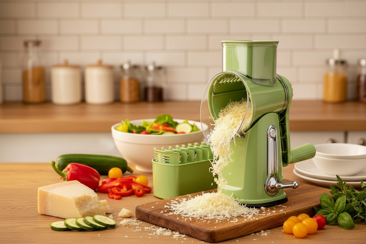 SUSTEAS Handheld Rotary Cheese Grater, equipped with 5 carefully designed blades and a strong suction cup base.
